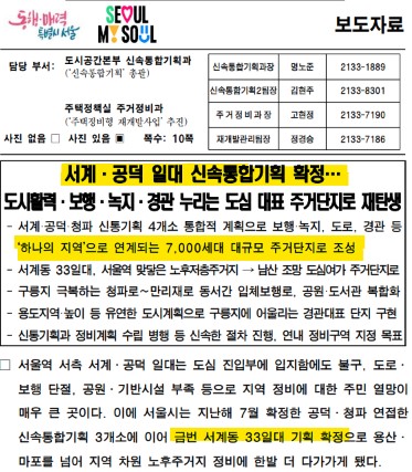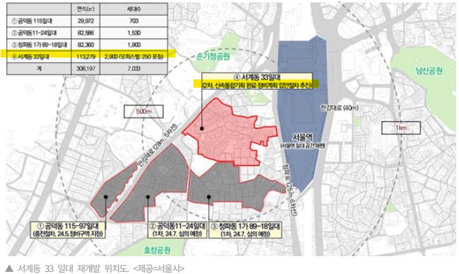 서울시는 서계동 33 일대의 재개발 신통기획을 확정했다고 발표했습니다. 이 재개발은 용산구 서계ㆍ청파와 마포구 공덕 일대 4개 구역에서 진행될 예정이며, 서울역 인근에 도시 활력과 보행 편의성, 녹지 공간, 남산 경관을 즐길 수 있는 대표적인 주거 단지로 탈바꿈할 것으로 기대됩니다. 서울시는 서계동 33 일대 외에도 지난해 7월에 재개발 신통기획이 확정된 마포구 공덕동 115-97(공덕 7 구역) 및 공덕동 11-24(공덕 A구역), 용산구 청파동 1가 89-18(청파 2 구역) 등 총 31만㎡, 7000 가구 규모의 대규모 단지 조성을 계획하고 있으며, 공덕 7 구역은 5월 30일 정비구역으로 지정되었고, 나머지 두 구역은 7월에 정비구역 지정을 목표로 하고 있습니다.