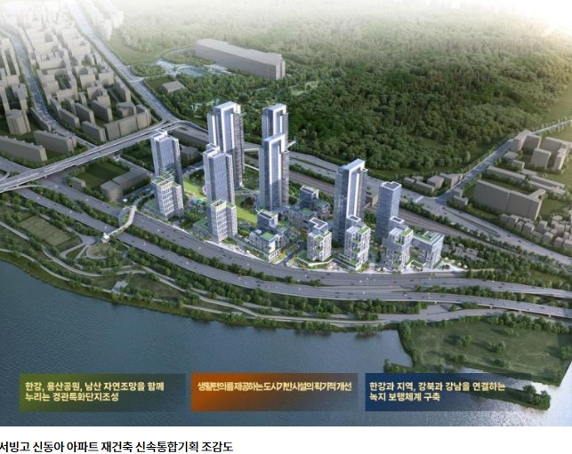 경의중앙선 서빙고역 초역세권 대단지로 앞 한강변과 용산공원이 자리잡고 있다. 용산 신동아아파트는 향후 동별로 높이가 다양하고 최저 20층, 최고 49층까지 수변주거단지에 미관을 고려하여 배치가 될 예정이라 한다.