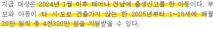 2025년부터 1~18세에 매월 20만원씩 총 4천320만원(현금지급)을 지원받는다.