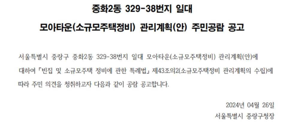 서울 중랑구 중화동 329-38 일대 모아타운 관리계획안 통과