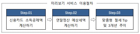 연말정산 미리보기는 크게 신용카드 소득공제액 계산하기, 연말정산 예상 세액 계산하기, 맞춤형 절세 및 3개년 추이 등으로 볼 수 있습니다.