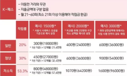 - K패스는 이동거리와 관계없이 대중교통 이용금액에 따라 일반 20%, 청년30%, 저소득53.3% 적립됩니다.