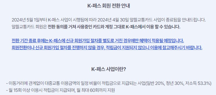 2024년 5월 1일부터 K패스 사업이 시행되고 2024년 4월 30일 알뜰교통카드 사업이 종료됩니다. 기존 알뜰교통카드 이용 회원은 전환 동의를 거쳐 사용 중인 카드 및 정보 그대로 K패스에서 바로 이용할 수 있고, 알뜰교통카드에서 K패스 전환 기간이 종료된 이후에는 K패스에 신규 가입을 통하여 혜택 적용이 가능하며, 가입 절차를 하지 않을 경우에는 적립금 지원이 불가합니다.